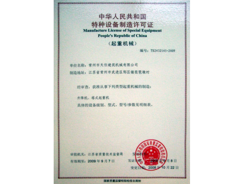 Manufacture License of Special Equipment